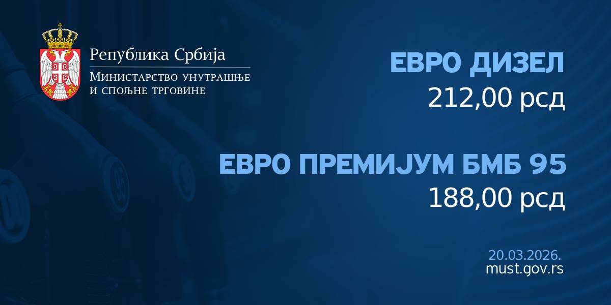 У складу са чланом 3. став 4. Уредбе о ограничењу висине цена деривата нафте („Сл. гласник РС 6/26, 16/26), утврђује се највиша малопродајна цена деривата нафте за период од 15 часова 20. марта 2026.године до 27. марта 2026. године, и то за:
