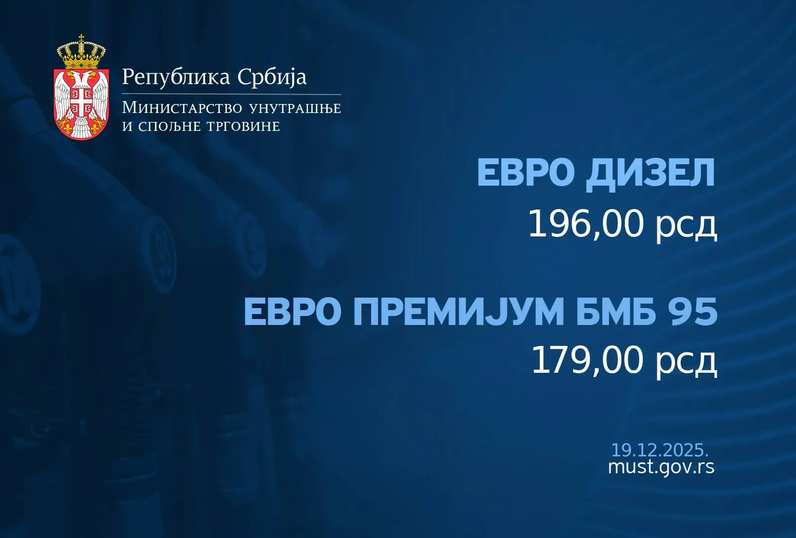 У складу са чланом 3. став 4. Уредбе о ограничењу висине цена деривата нафте („Сл. гласник РС“, бр. 64/25, 76/25 и 87/25), утврђује се највиша малопродајна цена деривата нафте за период од 15 часова 19. децембра 2025. године до 26. децембра 2025. године, и то за: