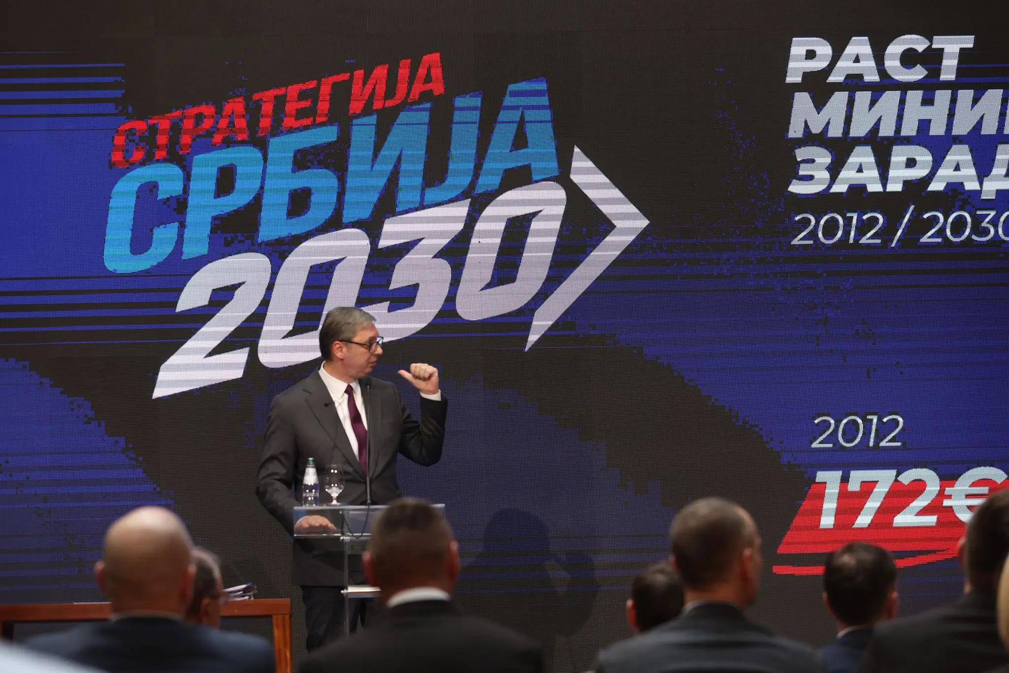 У двоипочасовном обраћању, кроз десет тачака, председник Републике Србије Александар Вучић, представио је данас у Палати Србија националну стратегију ,,Србија 2030”, која дефинише кључне правце развоја Србије у наредним годинама.