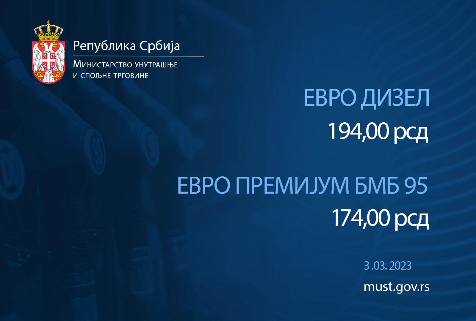 Ускладу са чланом 3. став 4. Уредбе о ограничењу висине цена деривата нафте („Сл. гласник РС“, бр. 15/23), утврђује се највиша малопродајна цена деривата нафте за период од 15 часова 03. марта 2023. године до 10. марта 2023. године, и то за: