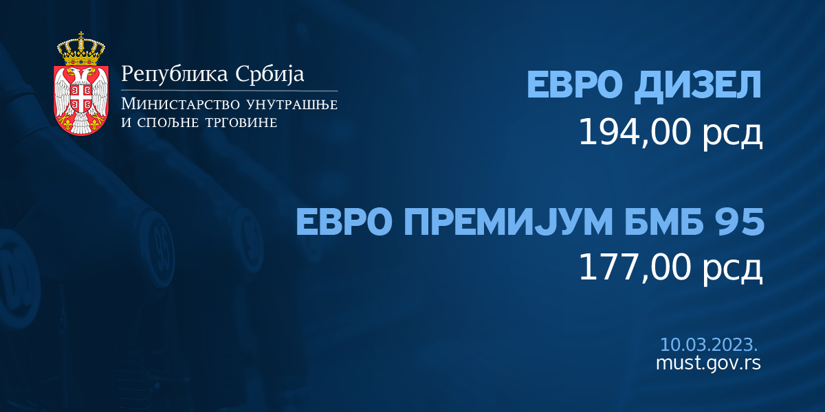 Ускладу са чланом 3. став 4. Уредбе о ограничењу висине цена деривата нафте („Сл. гласник РС“, бр. 15/23), утврђује се највиша малопродајна цена деривата нафте за период од 15 часова 10. марта 2023. године до 17. марта 2023. године, и то за: